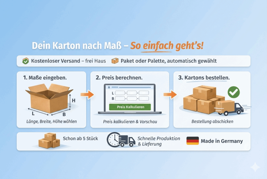 Mit dem Einfach Karton Konfigurator erstellst du deinen Karton exakt nach Maß: Länge, Breite, Höhe, Wellenart, Materialstärke – alles individuell anpassbar. Besonders attraktiv: Der Konfigurator eignet sich nicht nur für große Bestellungen, sondern auch für Kleinststückzahlen ab nur 5 Stück. So kannst du jederzeit bedarfsgerecht bestellen, ohne Übermengen produzieren zu müssen.